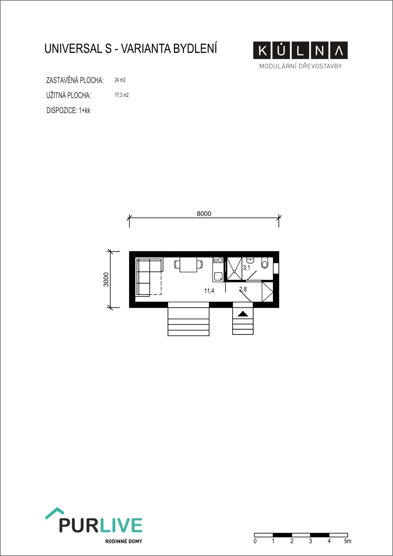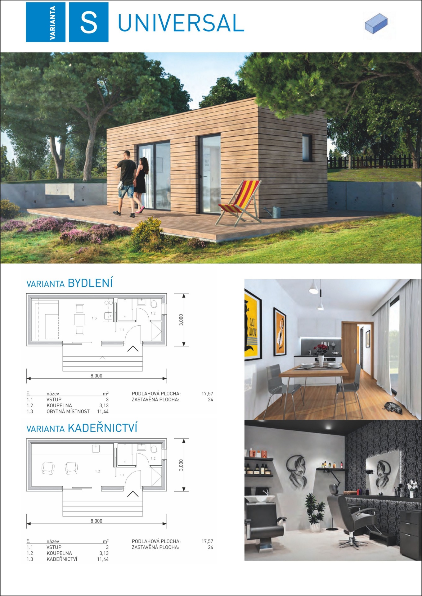Rostoucí domy pro moderní bydlení - to jsou Modulární dřevostavby KŮLNA. Varianta S-Universal je tvořená jedním zúženým základním modulem 8x3x3 metry s užitnou plochou 17,6 m2. Vše potřebné pro bydlení 1+kk je soustředěno na minimální ploše. Tuto sestavu je možné využívat nejen pro trvalé bydlení, ale výborně poslouží například jako zahradní domek pro hosty, rekreační objekt, ubytovací zařízení nebo jako komerční prostor, například malé kadeřnictví.