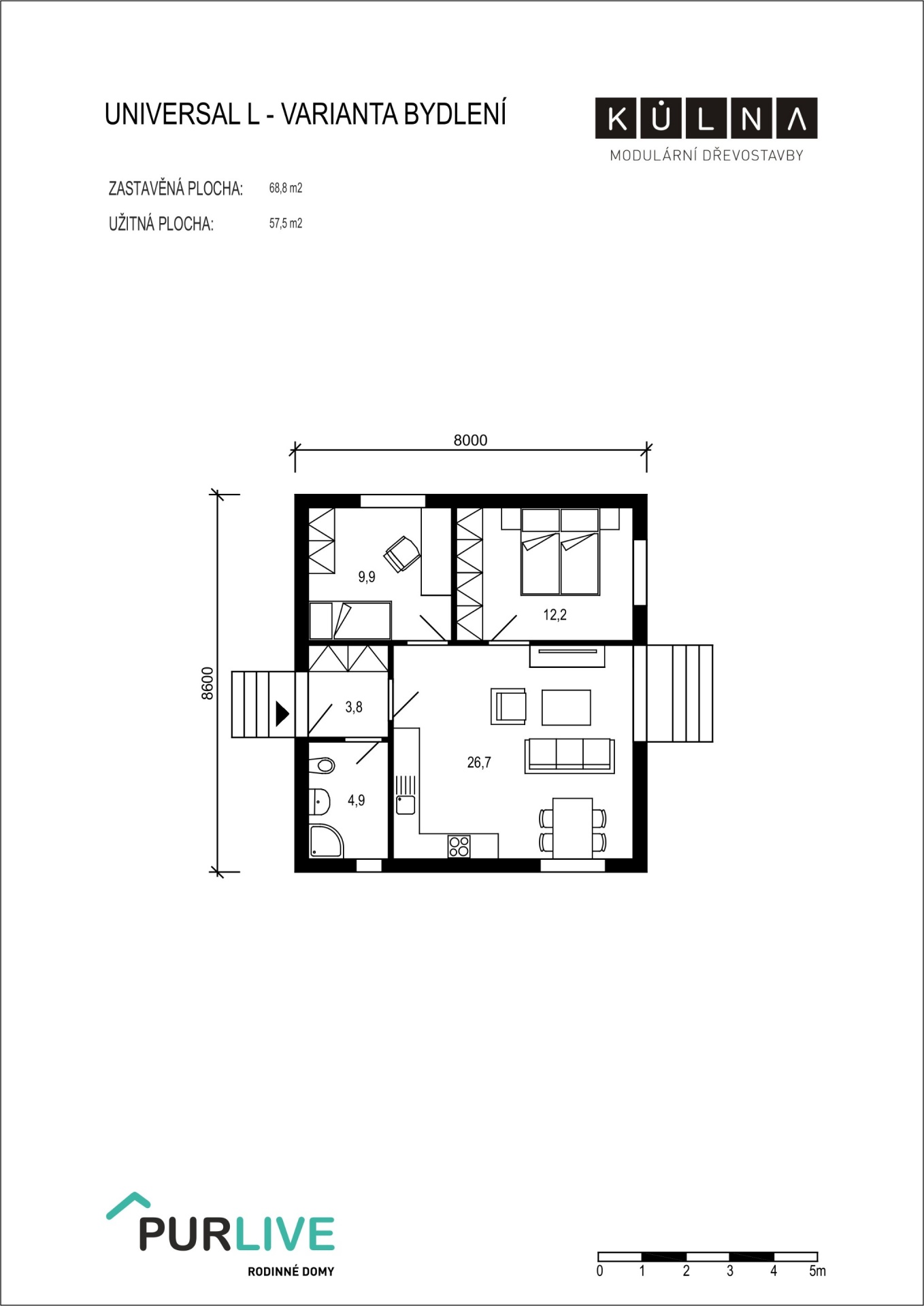 Rostoucí domy pro moderní bydlení - to jsou Modulární dřevostavby KŮLNA. Tuto variantu sestavy KŮLNY tvoří tři moduly na zastavěné ploše 69 m2. Jedná se o přízemní moderní dům 57 m2 užitné plochy a dispozicí 3+kk kterou tvoří velká obytná místnost s kuchyní, ložnice, pokoj a koupelna. Sestava má využití také pro rekreační nebo komerční účely.