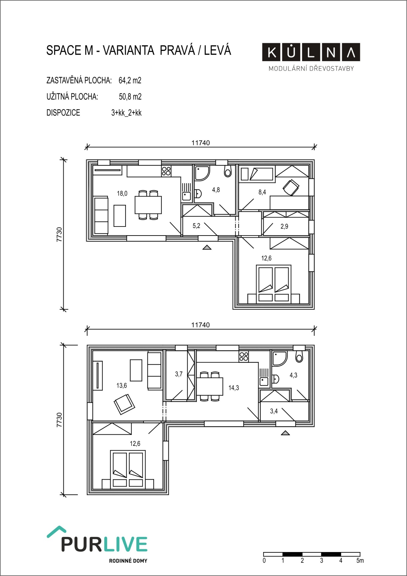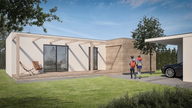 Rostoucí domy pro moderní bydlení - to jsou Modulární dřevostavby KŮLNA. Tuto sympatickou variantu sestavy KŮLNY tvoří dva moduly. Jedná se o přízemní moderní dům s 50,8 m2 užitné plochy a dispozicí 2+1 nebo ve variantě 3+kk.  Lze volit mezi dvěma variantami rozložení s jednou nebo dvěmi ložnicemi.  Výhodou je malá komora. Zejména v letních měsících oceníte závětří, které vytváří sestava ve tvaru písmene "L". Ideální volba pro malou rodinu.