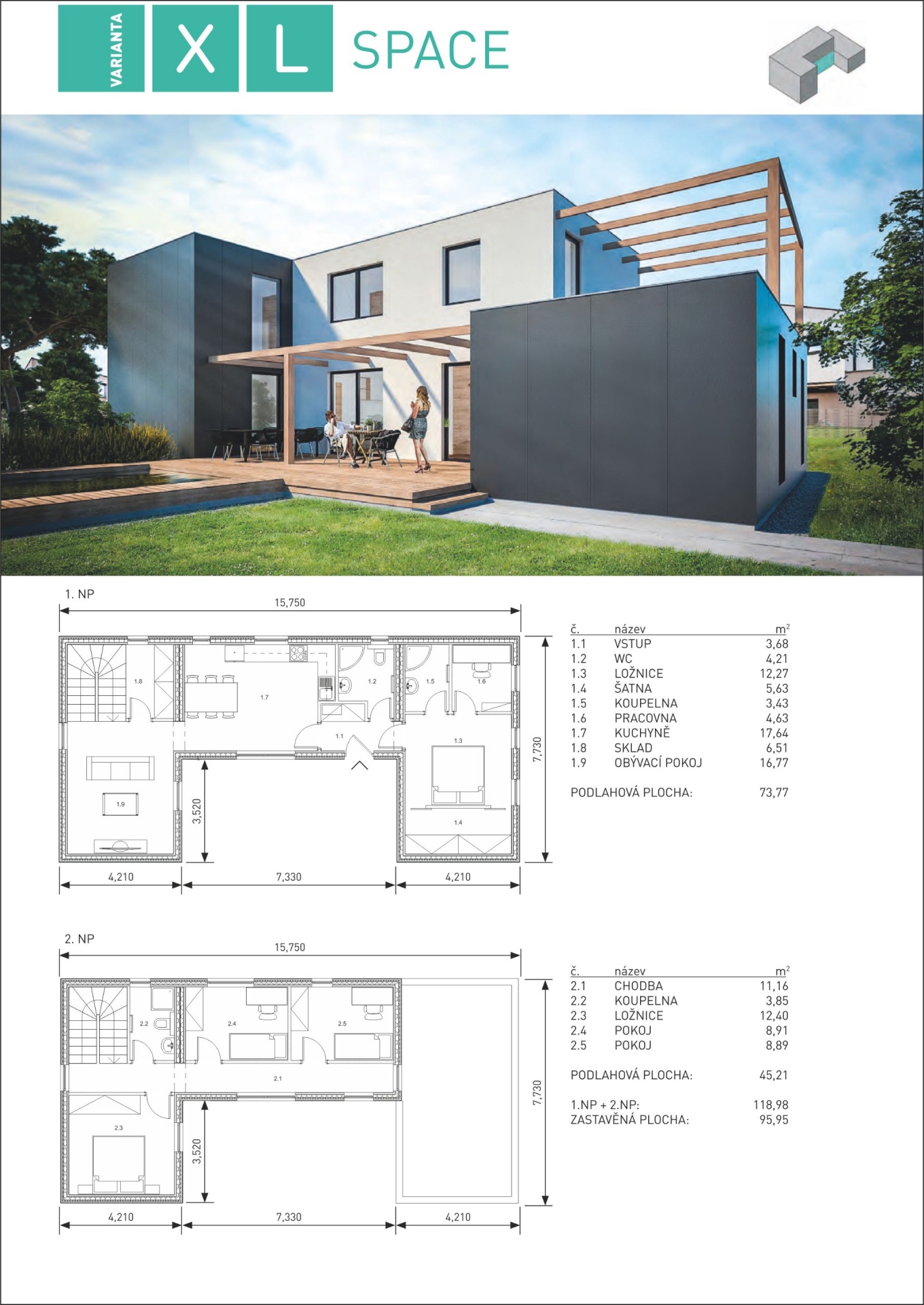 Rostoucí domy pro moderní bydlení - to jsou Modulární dřevostavby KŮLNA. Největší typová varianta která je složena celkem z pěti modulů. Moderní dům na zastavěné ploše 96 m2 nabízí komforních 119 m2 užitné plochy. V přízemí se nachází velký obytný prostor kuchyň, jídelna, obývací pokoj, koupelna a ložnice s další vlastní koupelnou a šatnou. V patře jsou umístěny ložnice a pokoje pro další čtyři osoby, doplněné malou koupelnou a WC. Výhodou je komora u schodiště v přízemí. Ideální patrový rodinný dům i pro menší pozemek.