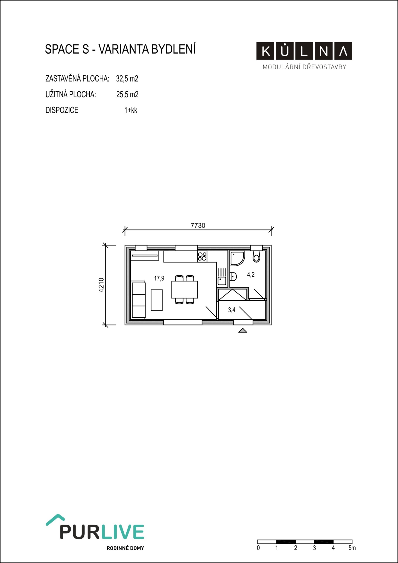 Rostoucí domy pro moderní bydlení - to jsou Modulární dřevostavby KŮLNA. Varianta S-Space je tvořená jedním základním modulem 8x4x3 metry s užitnou plochou 25,5 m2. Vše potřebné pro bydlení 1+kk je soustředěno na minimální ploše. Tuto sestavu je možné využívat nejen pro trvalé bydlení, ale výborně poslouží například jako zahradní domek pro hosty, rekreační objekt nebo ubytovací zařízení.