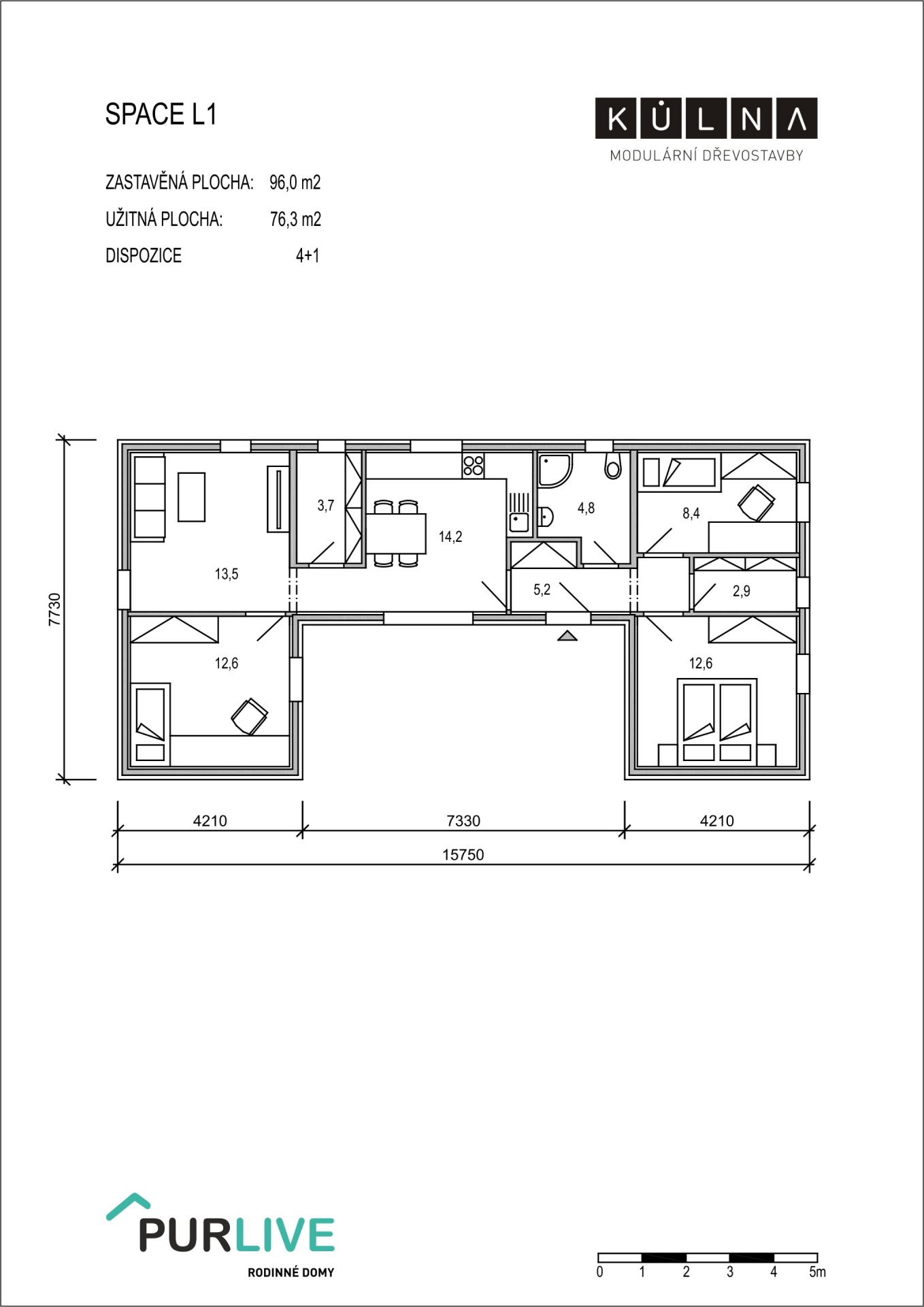 Rostoucí domy pro moderní bydlení - to jsou Modulární dřevostavby KŮLNA. Tuto variantu sestavy KŮLNY tvoří tři moduly na zastavěné ploše 96 m2. Jedná se o přízemní moderní dům 77 m2 užitné plochy a dispozicí 4+1 kterou tvoří kuchyň s jídelnou, obývací pokoj, ložnice, 2 pokoje a koupelna. Velkou výhodou jsou 2 komory. Zejména v letních měsících oceníte atrium které vytváří sestava ve tvaru písmene "U".