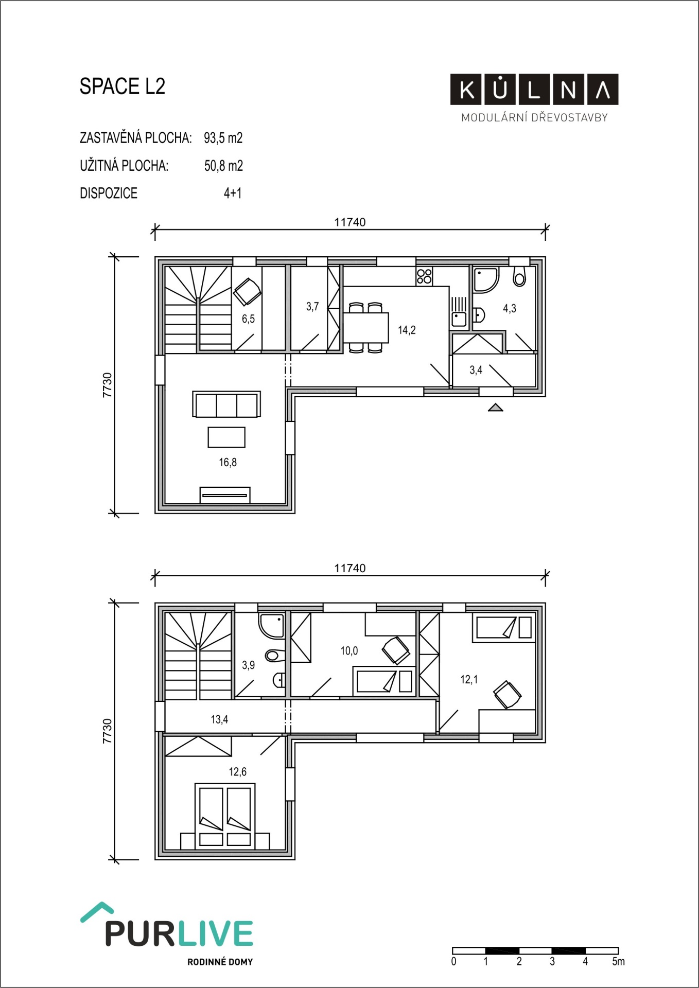 Rostoucí domy pro moderní bydlení - to jsou Modulární dřevostavby KŮLNA. Tuto variantu sestavy KŮLNY tvoří čtyři moduly na zastavěné ploše 64,2 m2. Moderní dům ve tvaru písmene "L" má 93,5 m2 užitné plochy a dispozicí 4+1. V přízemí se nachází obytná část kuchyň, jídelna a obývací pokoj se zázemím a v patře jsou umístěny ložnice s koupelnou, celkem pro 4-5 osob. Výhodou je malá pracovna. Ideální patrový rodinný dům i pro menší pozemek.